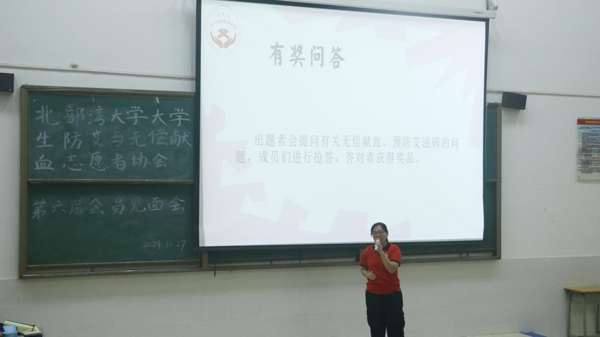 为加强会员间联系,团结协会成员,10月27日晚,北部湾大学大学生防艾与无偿献血志愿者协会在十一栋208阶梯教室成功举办第六届会员见面会。钦州市中心血站献血服务科科长张晓华,钦州市无偿献血志愿者协会会长梁琳、副会长宁弋珂、党支部书记彭珊出席活动,协会众多新老会员共同参与。