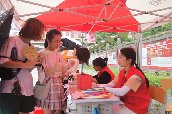 初晨的阳光洒落在大地,清脆的鸟叫声环绕在空中,志愿者忙碌的身影出现在校园。此时,他们正在搬桌椅,搭帐篷,快速准备活动所需的物品和布置场地。活动正式开始,志愿者们分工合作,现场井然有序。在校道上,志愿者们认真地进行献血知识宣传活动,路过的同学都很积极热情地参与到活动中:开心接收献血小知识宣传单、书写祝福语、进行党史答题和套圈小游戏等。现场热火朝天,欢乐声连绵不断。