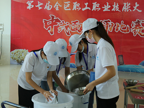 110名志愿者们分为接待组、开闭幕式服务组、货运代理组、大数据工程组、质量检验员组、中式面点师组、媒体组7个小组,各个小组分工明确,分布于各个比赛场地。比赛当日,志愿者们早早来到赛场集合,认真有序地开展每一项工作,细心为参赛选手准备好物品,做好检录工作,测量体温,引导选手入场等。从早上七点半至下午五点,甚至到深夜十一点,工作时间跨度大,志愿者们却从不抱怨。青年志愿者们热情的服务态度、不怕吃苦的精神受到了主办方领导、学校领导老师和参赛选手及裁判们的高度赞扬。
