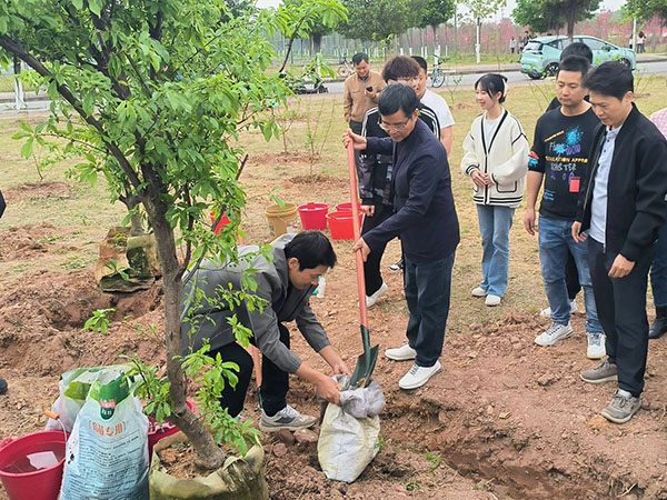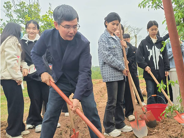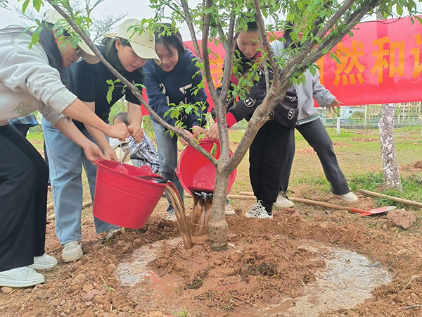 活动伊始,校友代表黄献梅、黄勇森为参与活动的师生讲解树苗种植的步骤。随后,在陈锦山副书记的带动下,参与活动的学生干部以及学生社团成员积极投入到植树活动中。大家热情高涨,配合默契,有条不紊地挖坑、栽树、盖土、浇水,将树苗栽培入土,现场氛围热烈而融洽。在大家的共同努力下,一株株树苗开启了在北部湾大学的成长之旅。小树苗的挺立,师生们的笑容,为校园的画卷上增添了一抹“春色”。