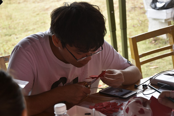 科技文化节主题围绕以“同心战疫情,青春勇担当”为主题的美术书法作品展、“剪出纸的文艺,刻出坭的风采”坭兴陶、剪纸体验两个活动展开。剪纸协会的成员进行现场教学,剪刻文艺作品。活动以展示作品为主,作品主要有色彩作品,速写作品,设计作品,书法作品,绘画作品和篆刻作品。这些各式各样的作品让同学们有了更多选择观赏的机会。而坭兴陶协会指导同学们手工捏花和雕刻。最后剪纸和坭兴陶作品都赠予了同学们。