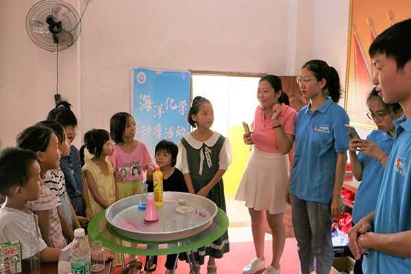 7月12日10点30分,海洋化学科普活动走进分新村,北部湾大学“海洋化学赋能乡村振兴”志愿服务团成员在分新村村民活动室为早早到场等候的30多名青少年开展了“石化微课堂”——系列海洋化学科普知识宣讲。志愿服务团成员向分新村青少年介绍常用的化学实验仪器,用日常生活中的食盐、醋、花生油、小苏打等包含海洋化学的元素向小朋友们展示“冰淇淋火山”、炫丽熔岩灯、可乐喷泉、蓝瓶子、手工皂的制作等趣味化学小实验,有趣又神奇的海洋化学实验,让乡村青少年多了些许期待与向往。志愿服务团成员带领乡村青少年一起遨游海洋化学科技世界,畅玩海洋化学趣味谜语游戏,引领他们一起探索海洋化学的奥秘,介绍海洋化学工业、海洋化学资源等内容,了解海洋化学与人们衣食住行的紧密联系,并以“海洋化学强国说”来帮助大家认识海洋化学工业对乡村振兴发展、国家强大的重要意义,讲述科学精神、铁人精神等,培育乡村青少年科学创新精神、奋斗精神,在实践中深入了解国情、区情、民情,传播海洋化学科普知识,赋能乡村振兴。