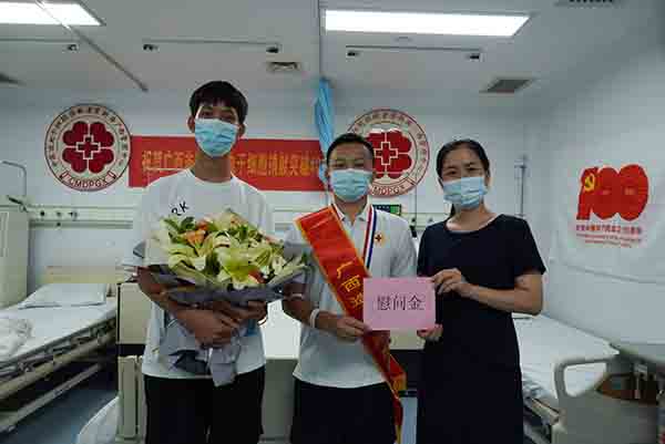 2018年10月,黄世威同学在18岁生日当天第一次参加无偿献血,把无偿献血当做最有意义的“成人礼”。2019年4月,黄世威同学参加第二次无偿献血,并在造血干细胞宣传采样动员活动中主动填写入库志愿者登记表和同意书,成为一名光荣的造血干细胞捐献志愿者。2021年5月,黄世威同学接到北海市红十字会初步配型成功的通知,他当即答应进行捐献。“能配型成功就是缘分,能救人一命当然义不容辞。”黄世威同学通过志愿者培训了解到,如今使用采集外周血的方法捐献造血干细胞,不用抽骨髓,和捐献血小板的过程相似,因此在安全性方面无需担心。自己家里人听说这件事,认为捐献造血干细胞可以救人一命,也都非常支持他。