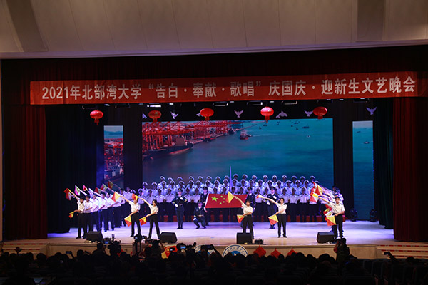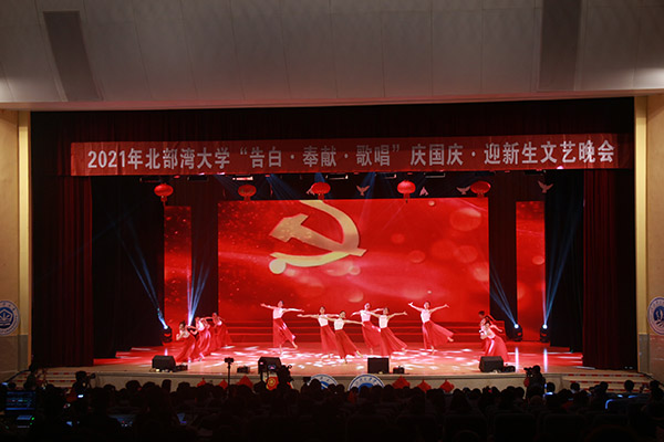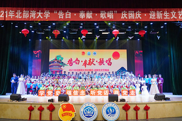 为了庆祝中国共产党成立100周年和中华人民共和国成立72周年,迎接新生的到来,9月28日晚,北部湾大学“告白·奉献·歌唱”庆国庆·迎新生文艺晚会在礼堂举行。校党委书记韩峻峰,校党委副书记陈锦山,副校长黄鹄,校党委常委、总会计师梁智,自治区社科联党组成员、副主席刘家凯,校党委常委、宣传部部长马秀明,自治区社科联学术部主任玉明,市社科联主席苏春华,团钦南区委书记黄钰楠,国家能源集团国华投资广西分公司财务总监刘相贞,中国联通钦州分公司副总经理郑林,中国电信钦州分公司战略客户二部副总经理吴颖洁,幼专团委副书记李琛琛,广西英华国际职业学院团委书记王梓,校团委书记郑德威与千名师生共同观看晚会。