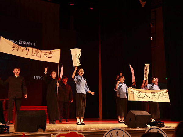 其中,由校学生会带来的原创朗诵《新时代是奋斗者的时代·青年大学习》,表现出了一代又一代有志青年奋斗在复兴伟大中华的主战场上,为青春续写光荣梦想。原创情景党课《湾大红》讲述了钦县第一个党支部和第一面五星红旗的诞生,用朗诵+情景剧的方式展现的红色湾大历史震撼了现场观众。舞蹈《党旗飘扬的地方》为晚会拉下序幕,在妙曼的舞姿中,仿佛看到党旗在这盛世飘扬。