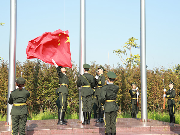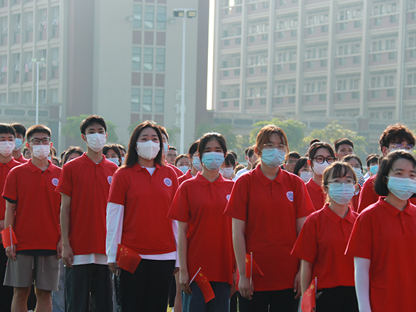 早上8:30,迎着初升的晨曦,师生代表在西区田径场举行庄严而又隆重的升旗仪式。在师生代表们的注目下,旗手们迈着整齐矫健的步伐向升旗台走去。鲜艳的五星红旗随着雄壮的国歌声冉冉升起,师生代表望着国旗迎风飘扬,心底的自豪感油然而生。随后,校党委常委、副校长唐高华致辞,他希望大家铭记历史,珍惜无数先辈用血肉之躯换来的和平生活。并鼓励湾大青年们以实际行动弘扬光荣革命传统、赓续红色血脉,为实现中华伟大复兴作出贡献。