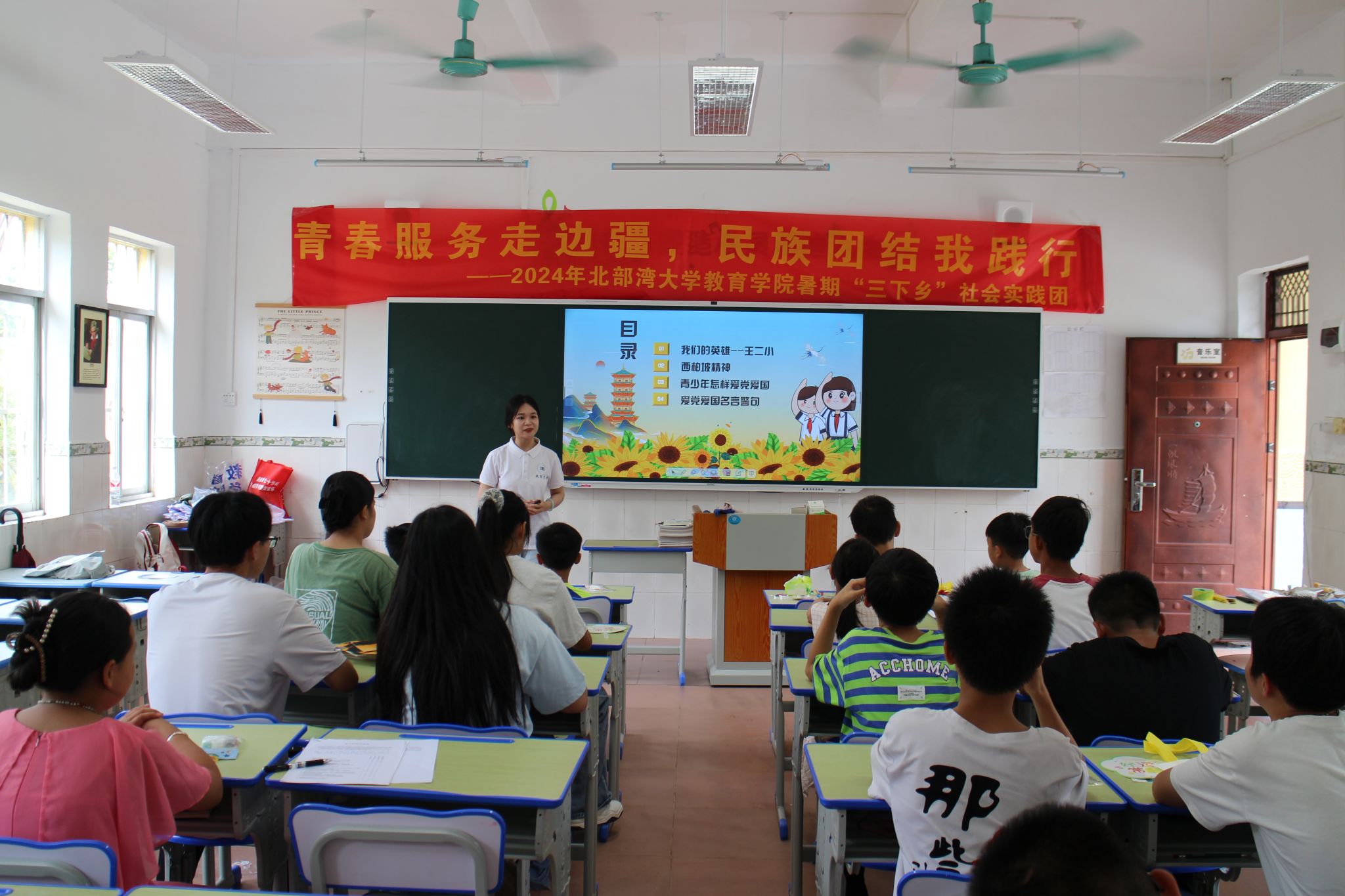 今年的暑期社会实践期间,作为广西高校,我校多支实践团队前往了边疆民族地区,通过多种类型的活动服务当地建设。实践团队紧紧围绕铸牢中华民族共同体意识的主线,为当地居民普及普通话及标准汉字使用,发挥团队成员特长为儿童开设折纸、舞蹈、手工等兴趣课堂,进行爱国主义宣讲,为当地文化建设、教育建设作出了贡献,获得了当地干部群众的一致好评。
