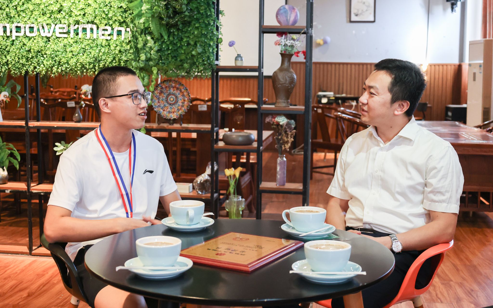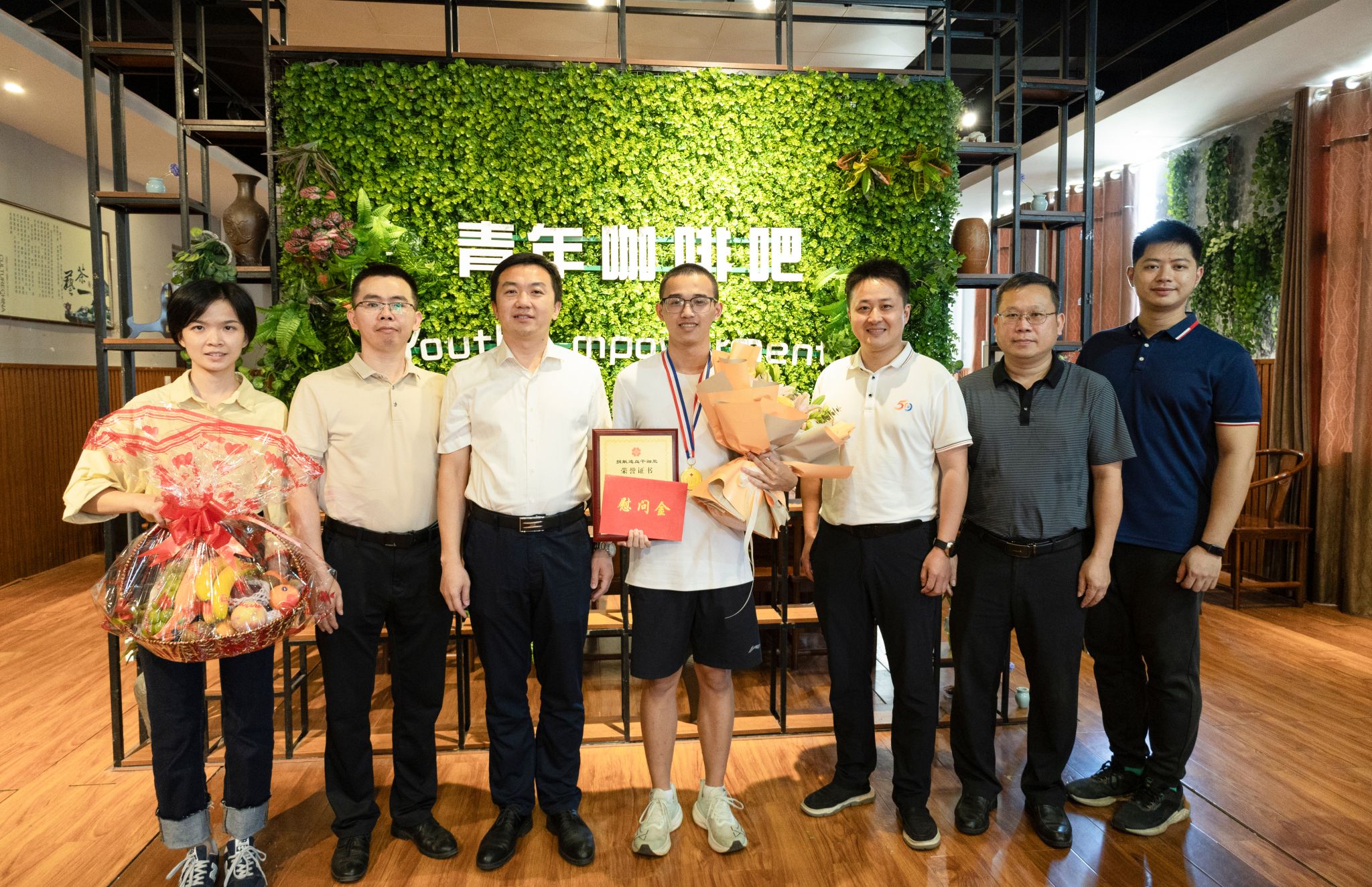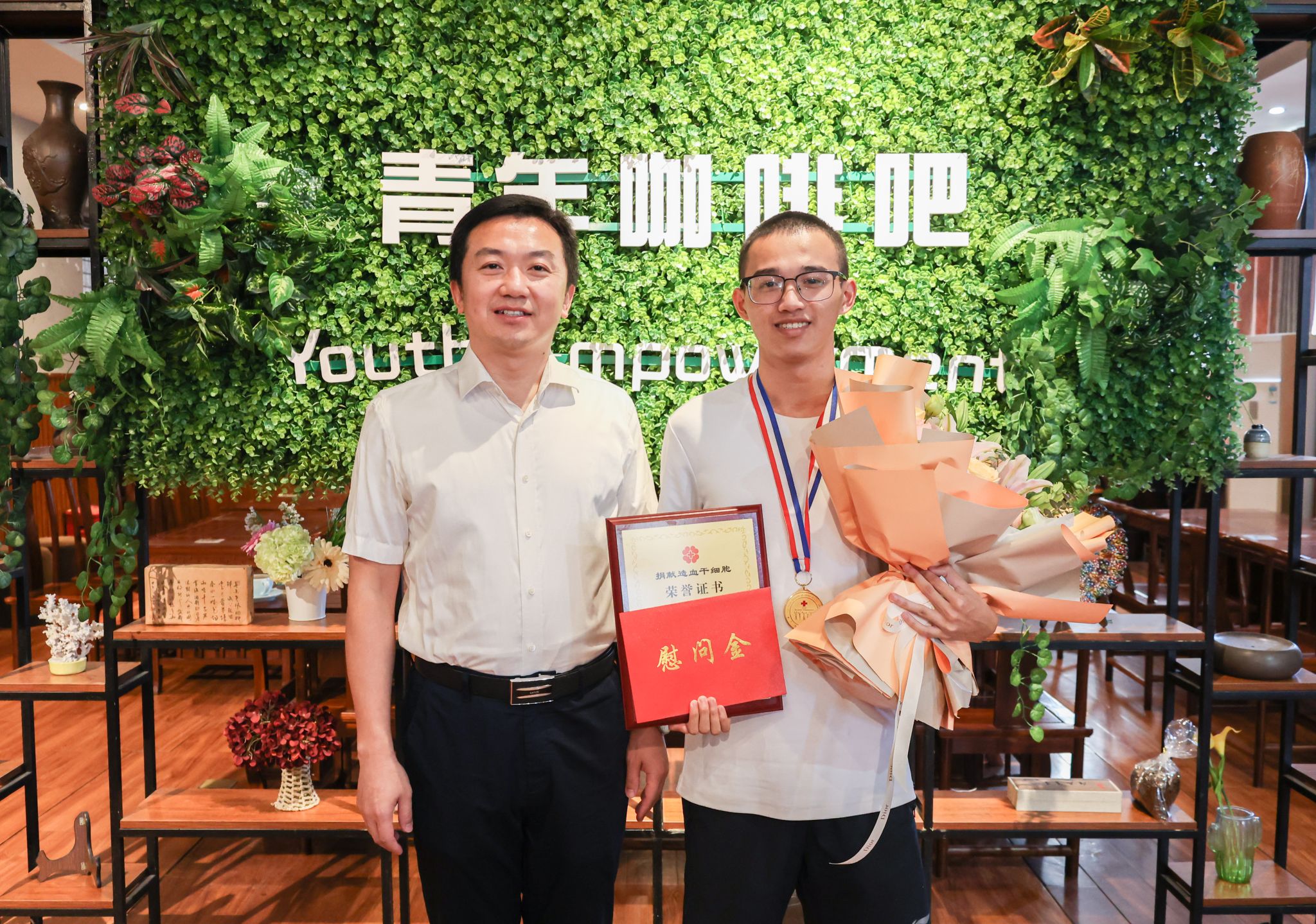 今年11月初,我校经济管理学院2024级学生周建林在广西非亲缘造血干细胞捐献定点采集医院捐献造血干细胞,救助一名千里之外的血液病患者。校党委副书记陈磊在经济管理学院青年咖啡吧慰问周建林同学。