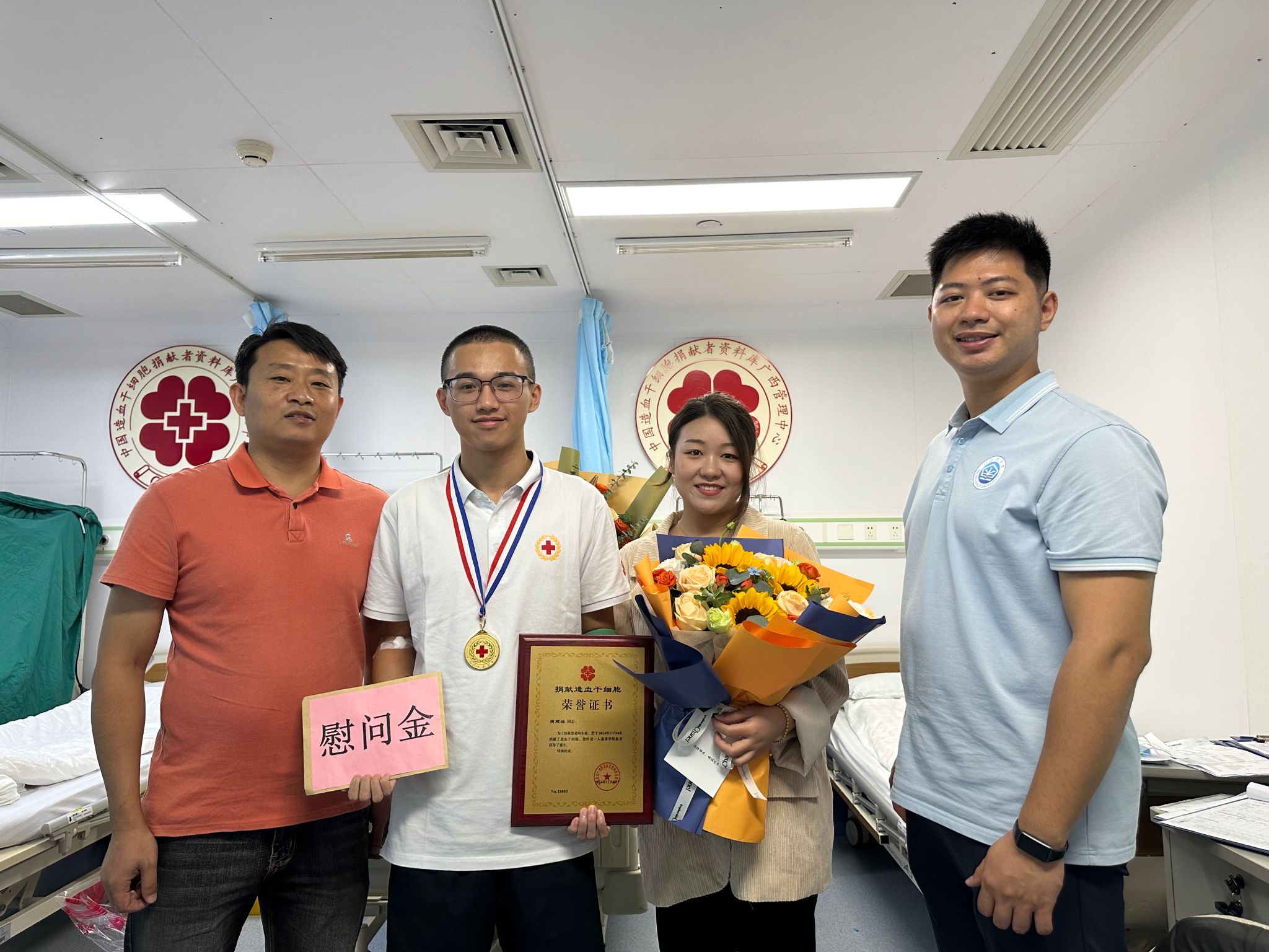 据悉,周建林同学是全国第18803例、广西第670例、钦州第27例、我校第2例非亲缘造血干细胞捐献者。住院捐献期间,经济管理学院及校团委老师与钦州市红十字会工作人员一同到病房探望了周建林同学,为他带去学校的关怀。(董丽莹 何紫晴 张芳 供图)