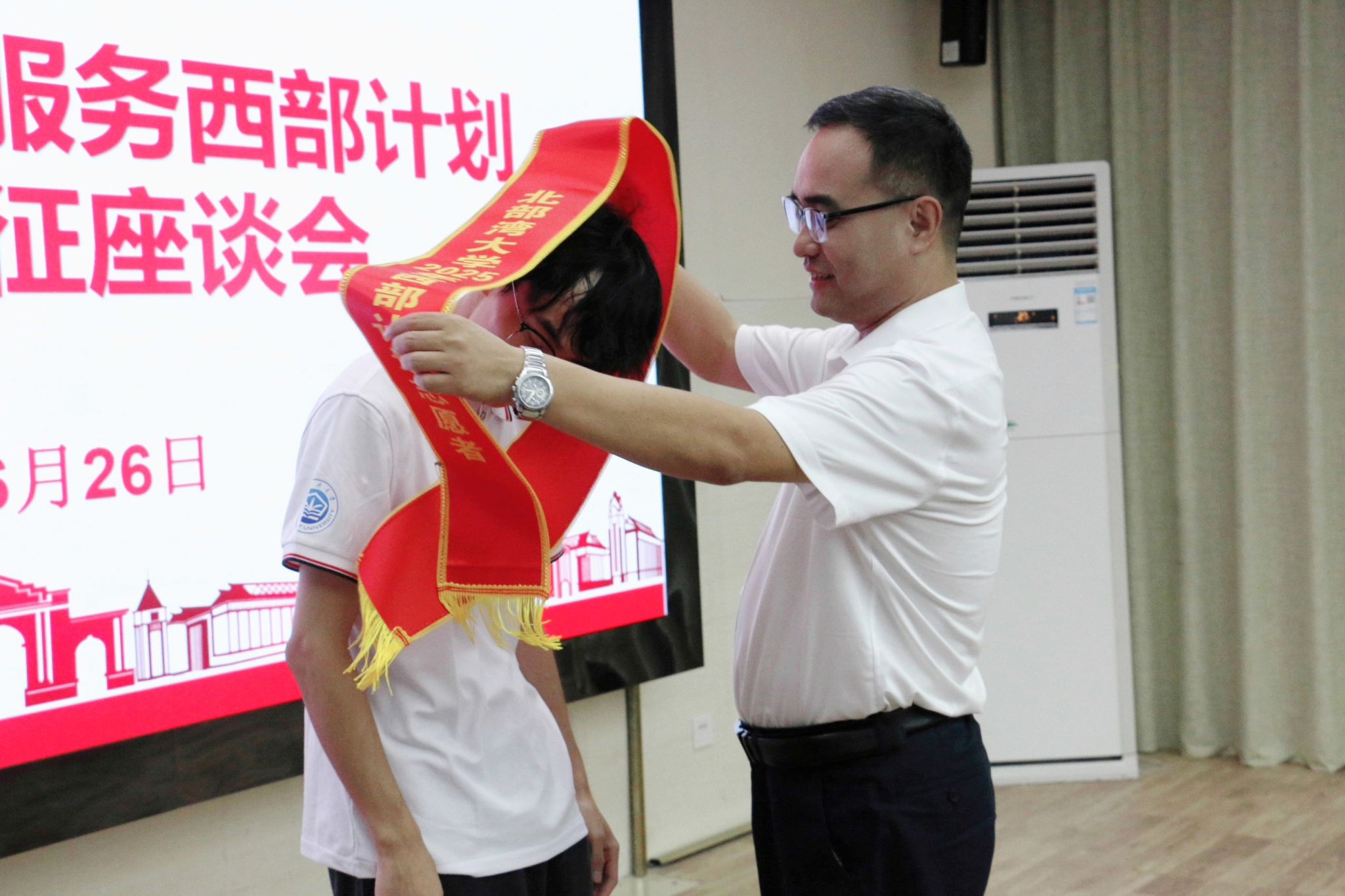 座谈会上,马秀明副校长依次为所有到场的西部计划志愿者佩戴绶带、发放行囊礼包,并与每一位在场西部计划志愿者合影留念。