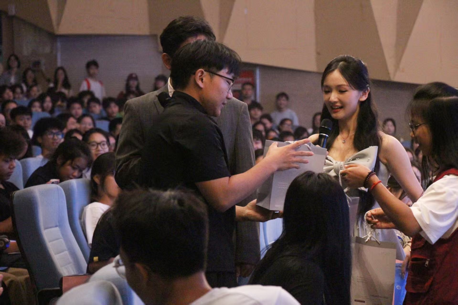 在比赛期间还穿插进行了现场互动,主持人围绕选手们演出的歌曲进行提问,在场师生竞相抢答,现场洋溢着欢乐的氛围。