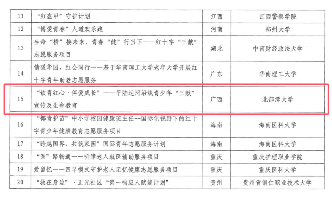 近日,中国红十字会总会向各省、自治区、直辖市及新疆生产建设兵团红十字会公布确定入选红十字青年发展计划的25个红十字志愿服务项目名单,北部湾大学“钦青红心·伴爱成长”——平陆运河沿线青少年“三献”宣传及生命教育项目名列其中,是广西唯一入选项目。