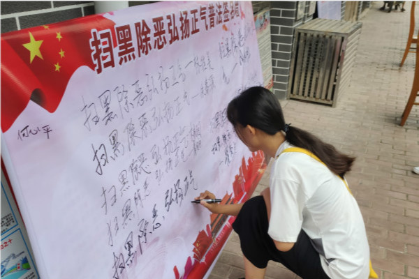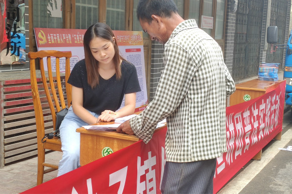 在经过前期半个月的材料收集和准备工作后,12日上午,宣讲团一行人在平乐县沙子镇司法所前开设服务点,对过往的民众进行法律知识宣讲,为其答疑解惑。其中,志愿者们在“五查五整顿”专项行动方面进行了重点宣讲,还在各人流量较大的地方派发法律传单及法律知识手册,用通俗易懂的语言向民众们普及了为何讲法、如何讲法和守法的重要性。活动中,同学们还举出不遵守法律而受到制裁的反例,鼓励接民众了解法律相关知识后,一同在“扫黑除恶”签名墙上签名点赞。