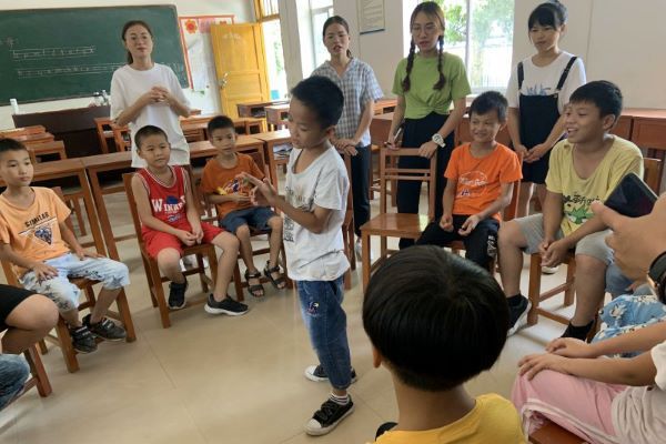 志愿团队以宣传普通话为主,教学为辅的形式矫正学生的语音。通过一节课时间,经过玩游戏进行交流,了解到学生的平舌音和卷舌音混淆,前鼻音和后鼻音难以分清。针对这一现象,通过拼音教学来矫正学生的语言语音。志愿者们把拼音字母分成四大板块进行教学,课上对学生进行形象记忆教学,让学生快速记住拼音字母的读音、书写。经过作业、提问、游戏等形式反复读、写拼音,让学生更准确的咬准字音。若有学生对拼音学习进度较慢,课后将进行“一对一”或“一对几”的辅导,在游戏中学习,加强师生友谊关系。在为期两周的教学活动结束后,以成果展来展示教学成果。学生通过表演节目来展示学习成果,如古诗背诵、课文朗诵、拼音字母游戏等。
