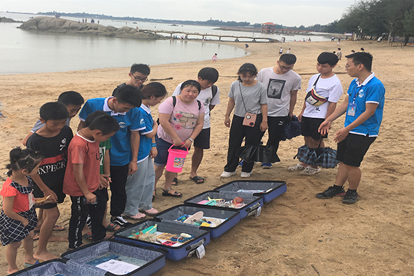 此次活动分为三部分。首先是问卷调查,调研团成员冒雨走访钦州市钦南区犀牛脚镇三娘湾村,为当地村民进行环境宣传教育并发放问卷调查130余份。通过统计问卷情况发现,大部分村民及游客赞同“海洋垃圾回收利用”这一做法,同时愿意参加进海洋环保公益活动中。也有少部分人认为海洋垃圾数量太多,很难将其处理好。在海洋知识科普中,成员在海滩摆放好宣传资料以及张贴悬挂海洋生物宣传画报图片,积极地给当地村民、游客以及小朋友讲述由海洋垃圾回收利用制作而成的可移动垃圾博物馆,为大家普及海洋垃圾对海洋生物和海洋环境的影响——我们的随手一丢,就是谋杀。最后是海洋垃圾清理和分类,团队成员组织小朋友们一起清理了海滩上的垃圾并进行了分类,其中最多的是塑料类垃圾,从学校到社会;从城市到农村;从游客到村民;从大人到小孩;用实际行动为海洋的蔚蓝奉献一份力量。