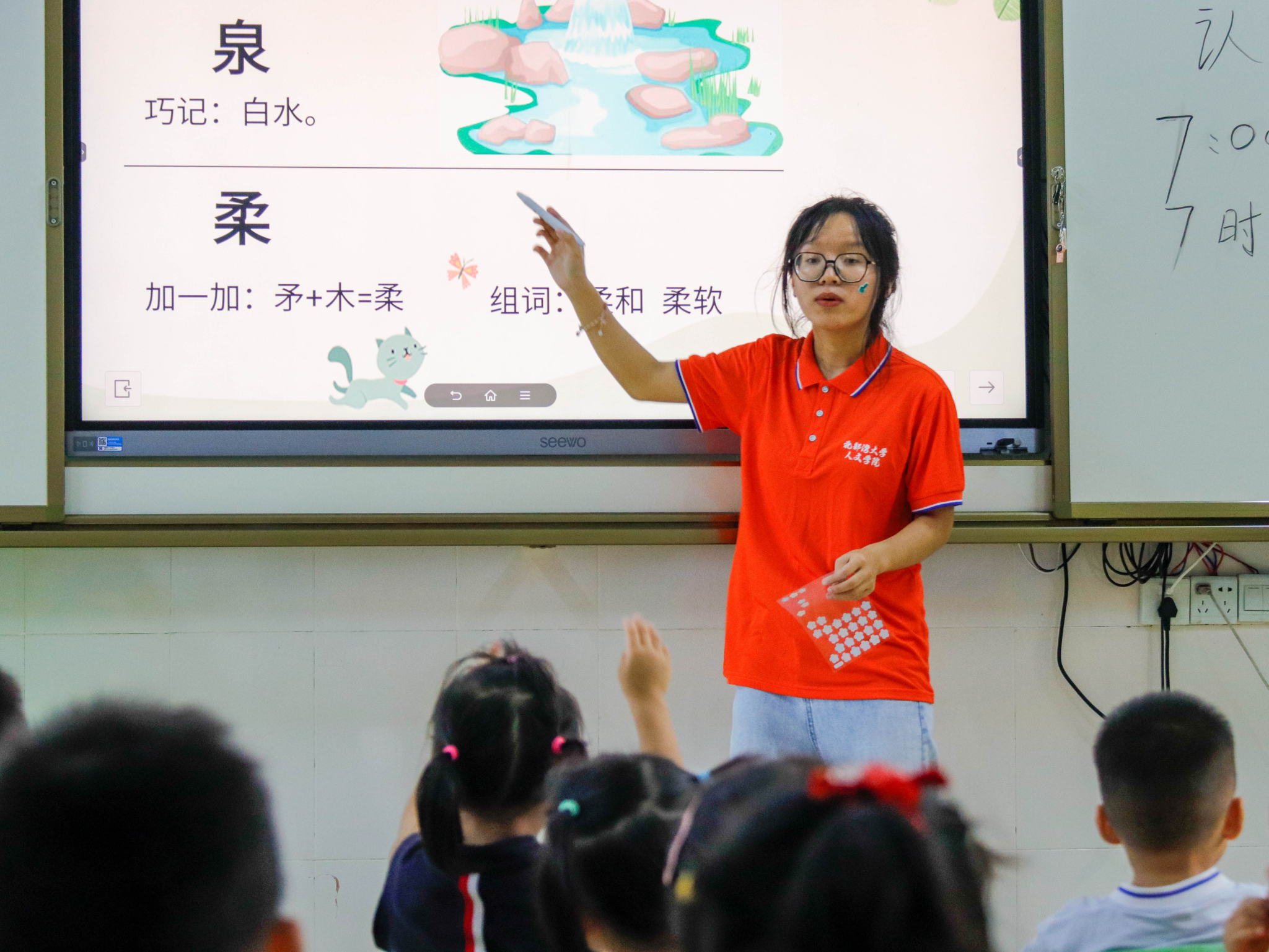 课堂教学分队则前往龙门港学校以“课堂教学+课堂小游戏”的形式为龙门港学校的小朋友带来唐诗宋词诵读、成语故事讲解等。
